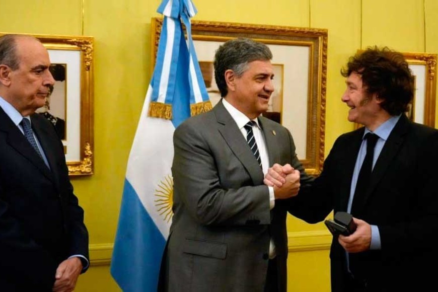 Jorge Macri y Milei se saludan, ante la mirada de Guillermo Francos.