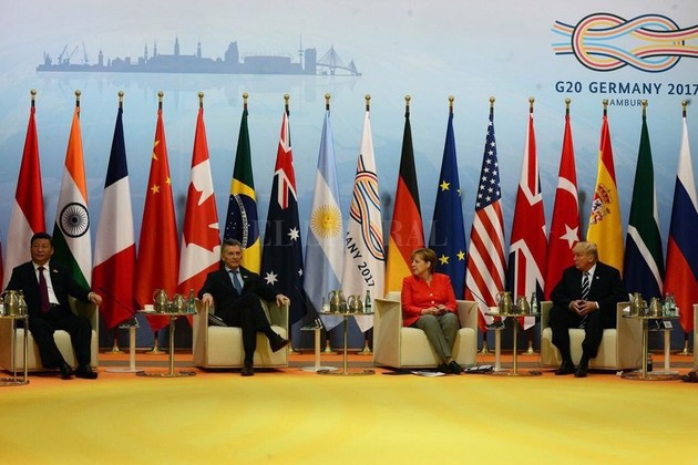 Macri estuvo en primera fila, ubicado a la derecha de la canciller alemana, Angela Merkel, por ser la Argentina el próximo anfitrión de la Cumbre en 2018, acompañado durante su exposición por el jefe de Gabinete, Marcos Peña; el canciller Jorge Faurie, y el ministro de Hacienda, Nicolás Dujovne.