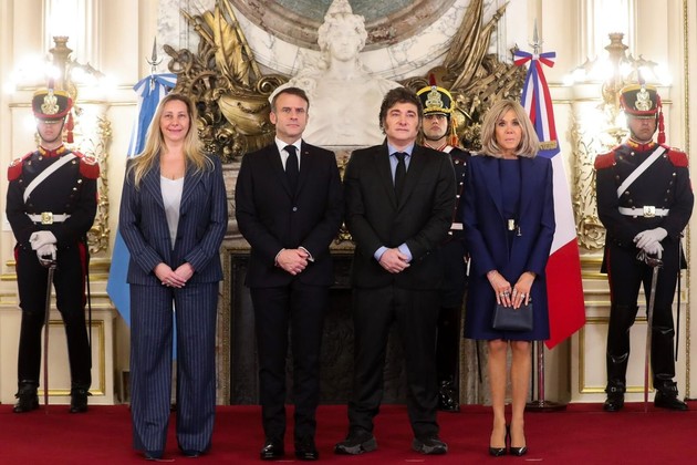 Al finalizar, el presidente francés se entrevistó allí mismo con empresarios argentinos y luego se tomó fotos con Milei, en el Salón Blanco de la Casa de Gobierno, a la que se sumaron la primera dama francesa Brigitte Macron y la secretaria general de la Presidencia, Karina Milei.