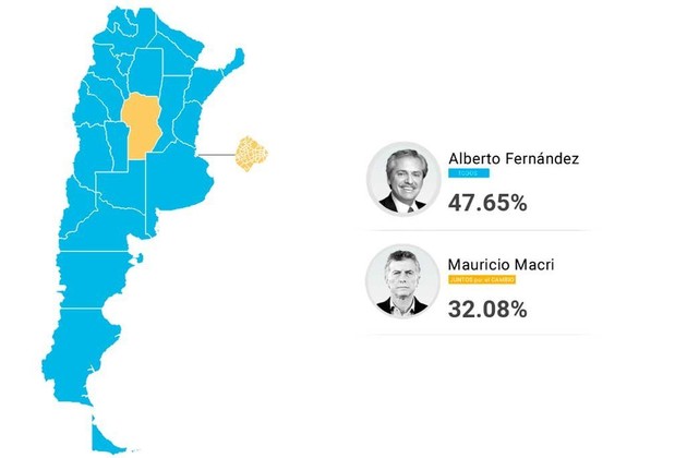 De esta manera, se conformó un nuevo mapa electoral que pinta a la República Argentina casi toda de “azul” menos dos distritos que quedaron “amarillos”. Es decir, Fernández se impuso en la mayoría de las provincias, salvo la ciudad de Buenos Aires y Córdoba, en donde ganó Macri.