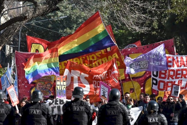 Mientras los jefes de Estado llegan a la capital provincial, gran cantidad de manifestantes convocados por la Multisectorial por los Derechos Humanos de Santa Fe y la Marcha del Orgullo, protestan en los alrededores, bajo la consigna “La cumbre del saqueo y la entrega”.