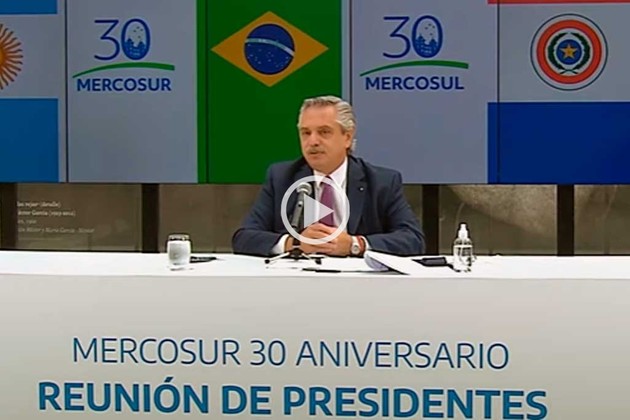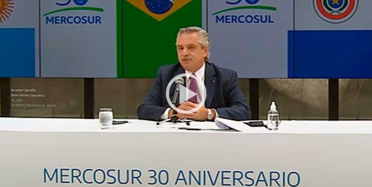 Alberto Fernández llamó este viernes a sus pares del Mercosur a "redoblar esfuerzos y profundizar la voluntad de caminar juntos", al cumplirse hoy 30 años de la creación del bloque, y pidió "no erosionar las estructuras productivas" de los países miembro.