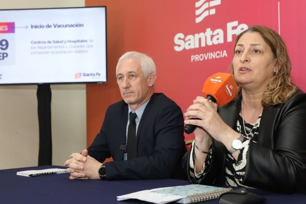 Silvia Ciancio y Cristian Cunha durante el anuncio de otra fecha clave en la estrategia contra el dengue: el inicio de la vacunación desde el 9 de septiembre de 2024. Gentileza