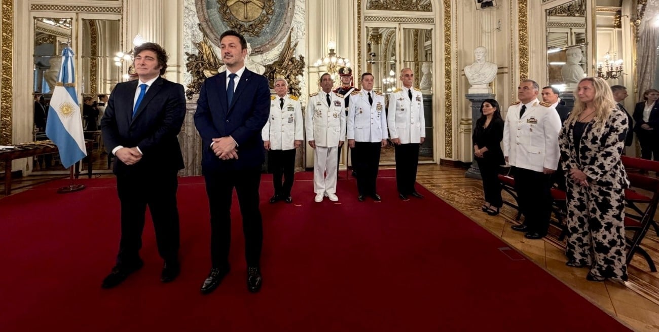 El acto se realizó antes del mediodía en el Salón Blanco de la Casa Rosada. Al lado del presidente estuvo el saliente ministro de Defensa, Luis Petri, quien el 10 de diciembre asumirá como diputado nacional por la provincia de Mendoza.