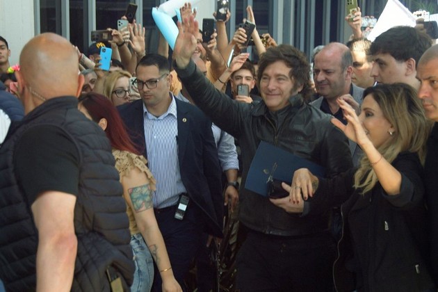 Entre que Javier Milei bajó del móvil y caminó unos pasos a toda prisa hasta las puertas de vidrio que se abren automáticamente pasaron solo unos minutos, que fueron suficientes para estrechar manos, repartir besos y ser una y otra vez fotografiado. Desde la comitiva presidencial, que lo cuidó sin mayores inconvenientes gracias al vallado, se veían solo rostros sonrientes, cánticos y pantallas de celulares. La contramarcha había quedado en la zona céntrica, lejos. Pero también allí se demoraron partidarios de Milei que con el correr de los minutos supieron del cambio de escenario para un encuentro partidario que no puede ser calificado bajo los términos tradicionales de un acto político. Acaso la concentración de campaña electoral pueda ser comparado con la previa de algún festival de música masiva (por tantas camperas de cuero podría ser de rock según los gustos de otras épocas ajenos al clima subtropical de Santa Fe), donde mandan el deber de los gritos agudos femeninos y también los cánticos que normalmente se aprenden en una cancha de fútbol o alguna fiesta de 15, había ciertamente mucha gente joven.