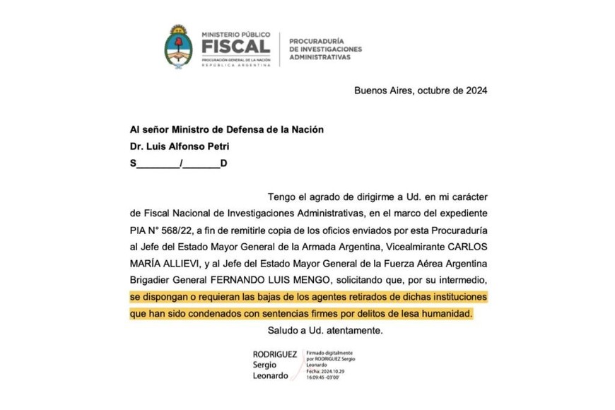 El documento fue enviado tanto al ministro Petri como al jefe de la Armada Argentina, Carlos María Allievi, y a su par de la Fuerza Aérea, Fernando Luis Mengo.