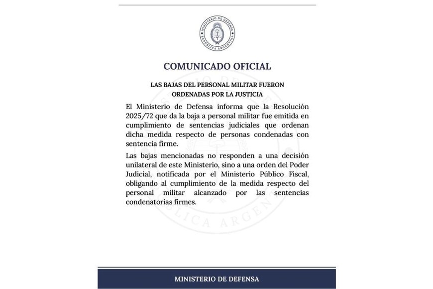 Según el Ministerio, las bajas "no responden a una decisión unilateral" de la cartera, sino que es una orden del Poder Judicial de la Nación que, a su vez, fue notificada por el Ministerio Público Fiscal, "obligando al cumplimiento de la medida" que se les aplicó a los 23 agentes militares que fueron imputados.
