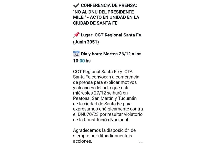 En lo que respecta a Santa Fe, este martes se realizará una conferencia de prensa previa a la manifestación bajo el título “No al DNU del Presidente Milei”.
