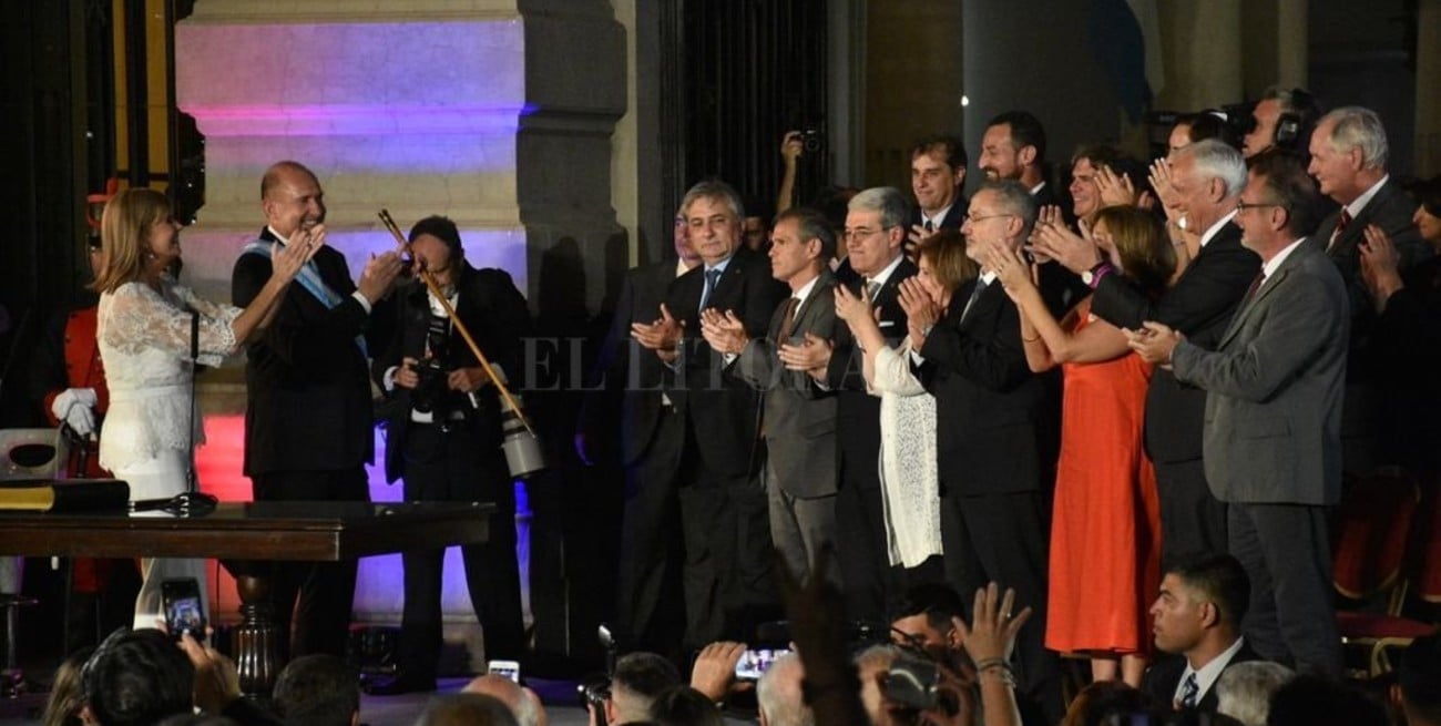 A continuación, ante una colmada Plaza 25 de Mayo, el flamante mandatario tomó juramento a su gabinete: Rubén Michlig como ministro de Gestión Pública; Esteban Borgonovo, de Gobierno, Justicia, Derechos Humanos y Diversidad; Walter Agosto, de Economía; Adriana Cantero, Educación; Marcelo Saín, Seguridad; Silvina Frana, Infraestructura, Servicios Públicos y Hábitat; Carlos Parola, Salud; Daniel Costamagna, Producción, Ciencia y Tecnología; Danilo Capitani, Desarrollo Social; Roberto Sukermann, Trabajo, Empleo y Seguridad Social; Jorge Llonch, Cultura; y Erika Gonnet Ambiente y Cambio Climático.