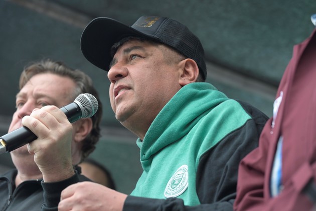 En el escenario que el camionero mandó a levantar por su cuenta, estuvieron otros gremialista de su facción cegetista, el Frente Sindical, como Omar Plaini (Canillitas), Daniel Ricci (FEDUN) y Juan Pablo Brey (Aeronavegantes).