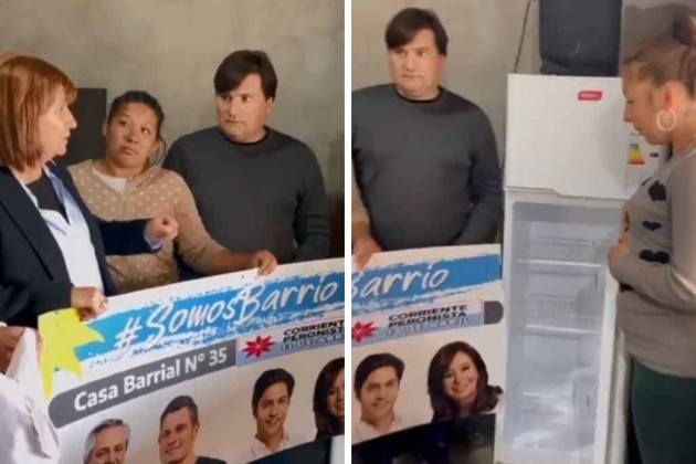 La misma mujer, que sería encargada de un comedor en ese distrito del conurbano, agregó: "Esta es la heladera que nos dieron en el Plan Abrazar, nos dijeron que teníamos que poner el cartel para recibir la heladera. Cada vez que (venían) nos traían mercadería para entregar a las familias: bolsón de mercadería, merienda, olla popular, cartel, pechera, el barbijo de (la (organización peronista) La 13, la bandera, que la tenemos colgada pero está levantada, y esas eran las condiciones".
