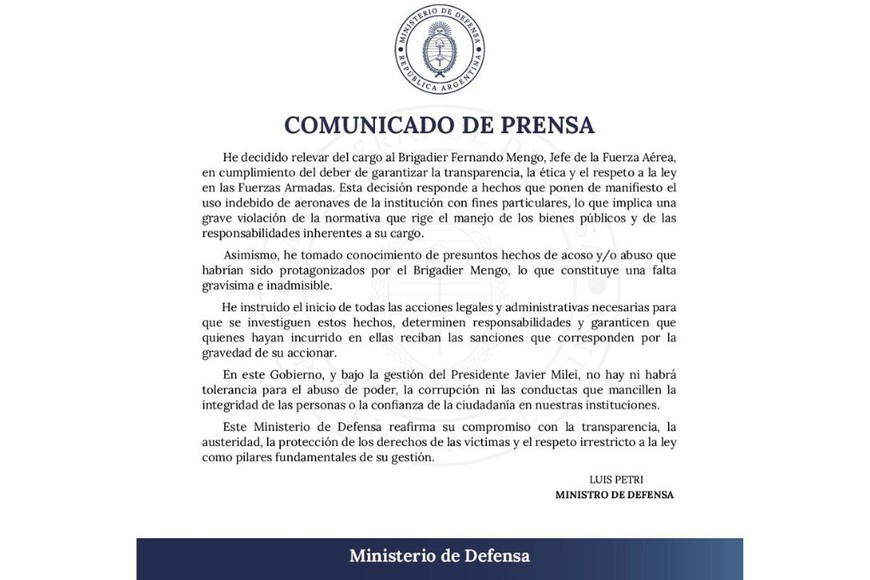 En un comunicado, el ministro de Defensa, Luis Petri, también sostuvo que ha "tomado conocimiento de presuntos hechos de acoso y/o abuso que habrían sido protagonizados por el Brigadier Mengo, lo que constituye una falta gravísima e inadmisible".
