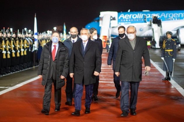 En su visita a con los primeros ministros Vladimir Putin, Xi Jinping y Mia Mottley de Rusia, China y Barbados, respectivamente, fue acompañado por el canciller Santiago Cafiero; los gobernadores Axel Kicillof (Buenos Aires), Raúl Jalil (Catamarca) y Arabela Carreras (Río Negro); el intendente de José C. Paz, Mario Ishii; el secretario presidencial Julio Vitobello, la Portavoz del Gobierno, Gabriela Cerruti, la secretaria de Relaciones Económicas Internacionales, Cecilia Todesca Bosco; la secretaria de Deportes, Inés Arrondo; y el embajador argentino en China, Sabino Vaca Narvaja.
