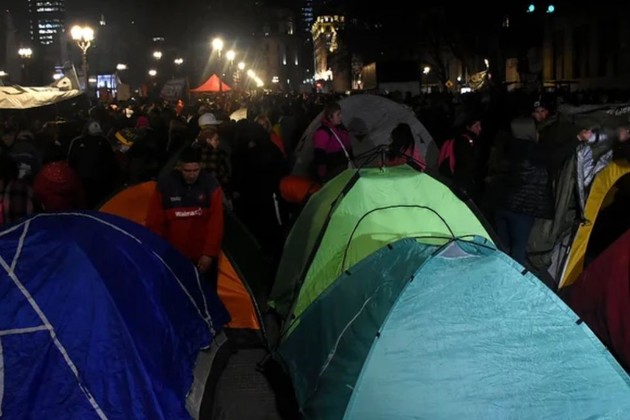 Tras haber entregado un pliego de demandas a las autoridades, los manifestantes montaron algunas carpas frente a la Casa Rosada y prendieron pequeñas fogatas para resguardarse del frío.