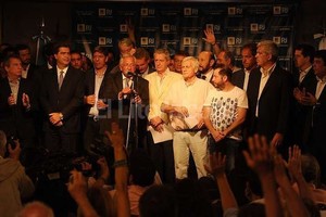 La lectura del documento de cuatro puntos estuvo a cargo del apoderado partidario, el diputado Jorge Landau, quien estuvo acompañado por el gobernador bonaerense, Daniel Scioli; el jefe de Gabinete, Jorge Capitanich, el presidente de la Cámara de Diputados, Julián Domínguez y el jefe del bloque de senadores del FPV, Miguel Pichetto.