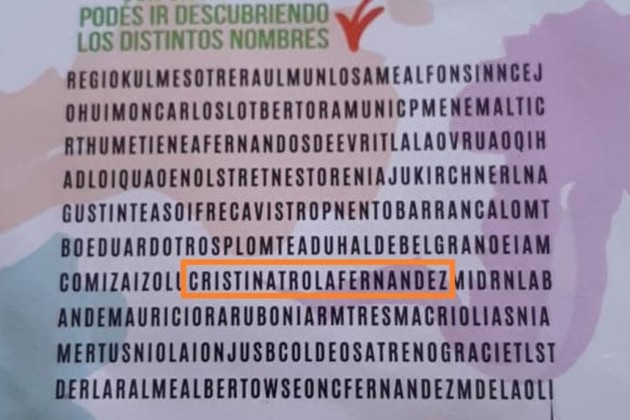 Dentro de la llamada sopa de letras, se invita a encontrar los nombres de los presidentes. Junto a la palabra Cristina, se puede apreciar el término “trola”.