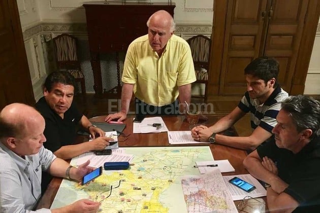 El gobernador de Santa Fe, Miguel Lifschitz, analizó la situación de la emergencia hídrica que afecta a buena parte del territorio provincial junto a los ministros de Seguridad, Maximiliano Pullaro; de Infraestructura y Transporte, José Garibay; y de Producción, Luis Contigiani; y el secretario de Protección Civil, Marcos Escajadillo. Durante la reunión, el mandatario provincial recibió informes de la situación y mantuvo contacto con intendentes y presidentes comunales de localidades afectadas.