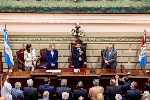 Había jurado por la memoria de Raúl Alfonsín, pasado por una plaza roja y blanca frente al Palacio Legislativo y dicho que es "un nuevo comienzo" su gestión pero "que no pretende ser fundacional, sino que se reconoce heredero de los 40 años de Democracia que los argentinos fuimos capaces de construir". La mayúscula está en el texto original que leyó Pullaro.
