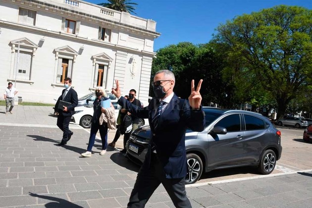 Sin hablar con los periodistas que lo esperaban al rayo del sol, con los dos brazos en alto, con ambas manos haciendo la V de la victoria, el director del Organismo de Investigaciones del Ministerio Público de la Acusación, Marcelo Sain, ingresó a la Legislatura de Santa Fe para defenderse ante el proceso que se ha iniciado en la Comisión de Acuerdos que lo acusa de llevar a cabo actividades proselitistas como integrante del Poder Judicial de la Provincia.