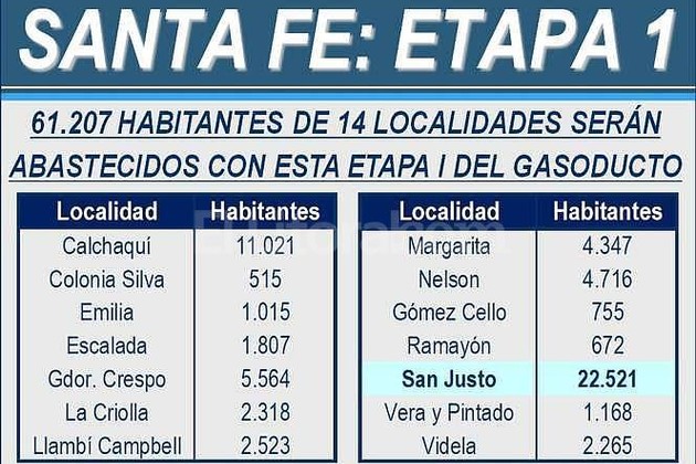 En la Etapa I se abastecen en total a 23 localidades de 3 provincias de las cuales 8 son de Formosa (Chiriguanos; Laguna Yema; Pozo del Mortero; Ing. Juárez; Pozo de Tigre; Bazán; Estanislao del Campo y Las Lomitas); 1 de Salta (Los Blancos) y 14 de Santa Fe (Llambí Campbell; Emilia; Nelson; Escalada; Gobernador Crespo; Gómez Cello; Ramayón; San Justo; Vera y Pintado; Videla; La Criolla; Calchaquí; Margarita y Colonia Silva).
