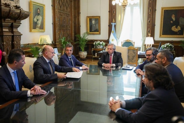 El presidente de la Nación, Alberto Fernández, encabezó en Casa Rosada la firma de la garantía para el financiamiento del acueducto interprovincial Santa Fe - Córdoba, junto al gobernador santafesino, Omar Perotti; el vicegobernador cordobés, Manuel Calvo; el canciller Santiago Cafiero; el ministro de Economía, Sergio Massa, y el embajador de Kuwait, Abdullah Ali Alyahya.