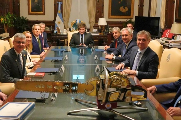 Javier Milei durante la reunión con el secretario del Tesoro de EE.UU., Scott Bessent -ubicado a su derecha, con corbata verde- . Foto: Presidencia