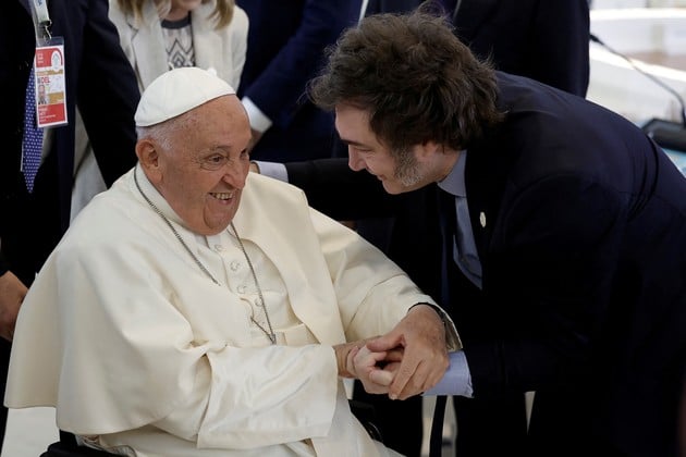 El papa Francisco y Javier Milei este viernes en Borgo Egnazia, Italia. Crédito: Louisa Gouliamaki/Reuters