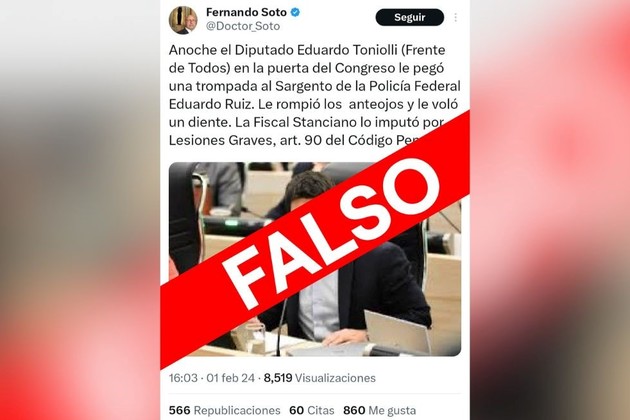 Circuló en "X" la versión según la cual el legislador santafesino por el frente de todos, en medio de los desmanes de manifestantes de izquierda contra el Congreso, bajó la plaza y le pegó una trompada a un agente de la Policía Federal, por lo que recibió imputaciones e intervino un fiscal.