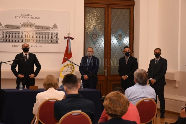 El gobernador Omar Perotti encabezó anoche en el Salón Blanco de la Casa de Gobierno el acto de jura de tres ministros con lo que después de dos meses, volvió a quedar completo el gabinete. Roberto Sukerman fue puesto en funciones como titular de Gobierno, Justicia, Derechos Humanos y Diversidad: Marcos Corach en Función Pública y Juan Manuel Pusineri en Trabajo, Empleo y Seguridad Social. Los tres venían ocupando cargos en la gestión provincial y en sus palabras, Perotti puso el acento en la necesidad de acercar más el gobierno a la sociedad.