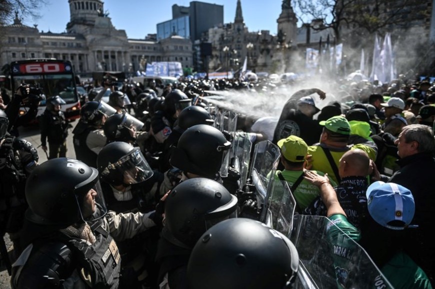 Antes del tratamiento en el Senado, trabajadores del emblemático hospital Garrahan, del INTI, del INTA y de camioneros, que son los afectados por los distintos proyectos que se tratan en la sesión. Al avanzar el debate en el recinto, las fuerzas de seguridad avanzaron sobre los manifestantes que ocupaban las calles. Fotos: Clarín.