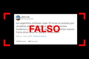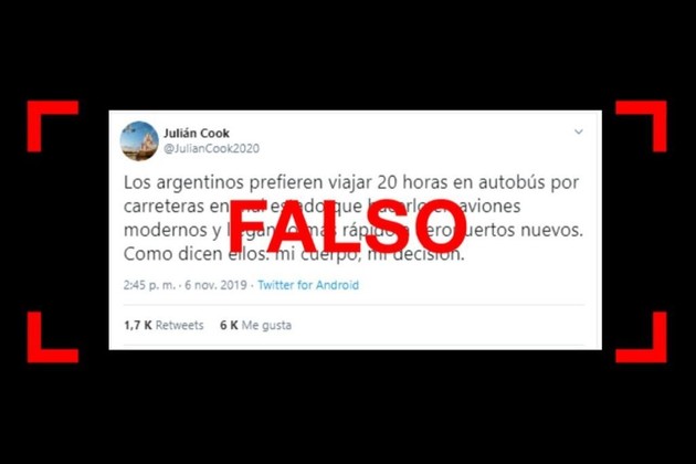 La cuenta @JulianCook2020 publicó un tuit que dice: “Los argentinos prefieren viajar 20 horas en autobús por carreteras en mal estado que hacerlo en aviones modernos y llegando más rápido a aeropuertos nuevos. Como dicen ellos: mi cuerpo, mi decisión” (sic). La publicación se produjo el mismo día en que se supo que el ex CEO y fundador de la aerolínea de bajo costo Flybondi, Julian Cook, abandonará el país, a raíz de la victoria de Alberto Fernández (Frente de Todos). Reverso pudo comprobar que el tuit y esa cuenta de Twitter son falsos.