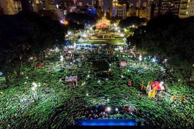 Amnistía Internacional se manifestó esta noche frente al Congreso con perchas luminosas, para exigir que el Senado apruebe el proyecto.