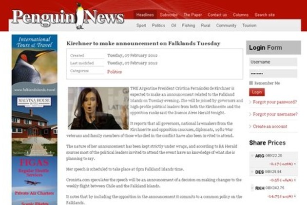 La convocatoria de la presidenta Cristina Fernández de Kirchner a un acto en la Casa Rosada para esta tarde, donde haría un anuncio sobre las islas Malvinas, despertó la expectativa en el archipiélago. La noticia es el título principal del portal "Penguin News", el único diario local.
