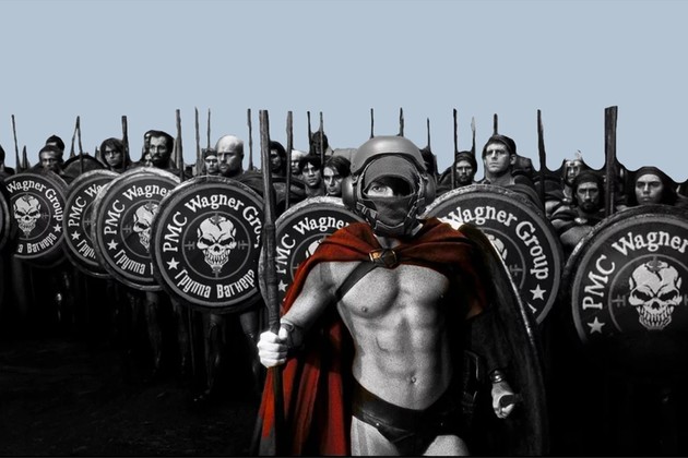 Espartanos: un afiche combina la estética de la película "300" con las máscaras y el logo del PMC Wagner, en una demostración del conocimiento propagandístico del grupo militar.