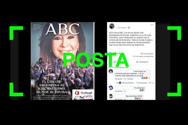 Circula en Facebook una imagen donde se ve una supuesta portada del diario español ABC con la cara de Cristina Fernández de Kirchner, candidata a vicepresidenta por el Frente de Todos, con el siguiente titular: “El giro de Argentina al kirchnerismo hunde su divisa”. Efectivamente, el medio español publicó esta tapa el 13 de agosto último, luego de que se conociera la victoria de la coalición que encabeza Alberto Fernández junto a la ex presidenta en las elecciones Primarias Abiertas Simultáneas y Obligatorias (PASO) del 11 de agosto último.