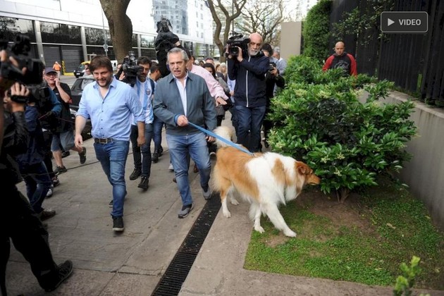 El candidato a presidente de Frente de Todos, Alberto Fernández, salió de su departamento de Puerto Madero para pasear a su perro Dylan por los espacios verdes del barrio antes de ir a votar.