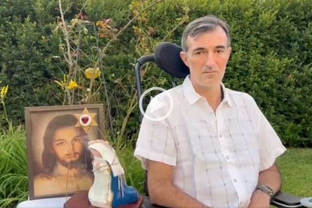 Junto a imágenes de Jesús y la Virgen María, el ex legislador de 52 añosposteó el video en el cual se puede oír su mensaje a través de una aplicación que reproduce su propia voz en off, ya que la ELA es una enfermedad que genera dificultades para realizar diversas tareas, como hablar o comer.