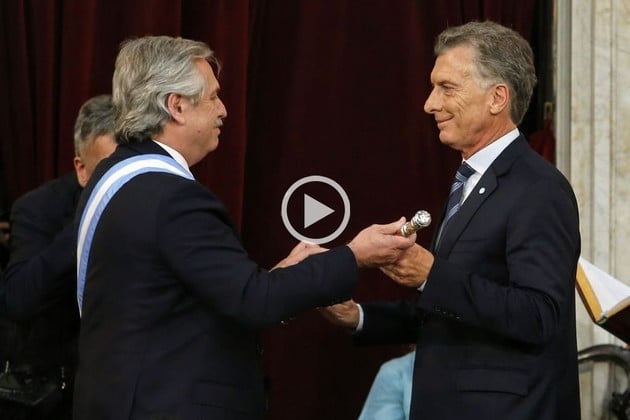 Luego del juramento, el presidente Alberto Fernández recibió de manos del saliente Mauricio Macri el bastón y la banda, atributos de mando.