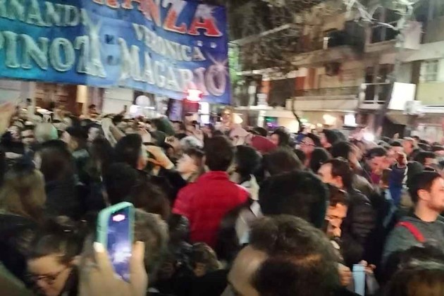 Mientras la policía trabaja en el lugar del hecho, vecinos manifiestan su apoyo a la vicepresidenta con cánticos y bombos.