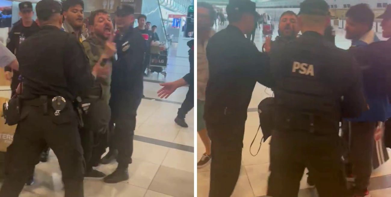 Al grito de “chorro” y “ladrón”, un grupo de pasajeros que esperaban para tomar sus vuelos cuestionaron el dirigente social que reaccionó a los gritos y debió ser cercado por efectivos policiales mientras los celulares lo apuntaban.