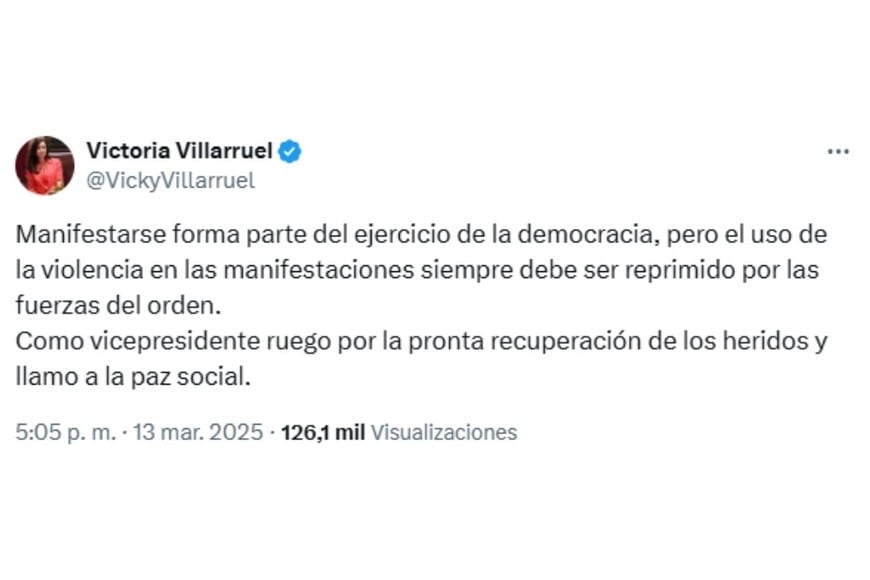 Luego, reafirmó su posición a través de una publicación en su cuenta de la red social X, haciendo un llamado a la paz social: "Manifestarse forma parte del ejercicio de la democracia, pero el uso de la violencia en las manifestaciones siempre debe ser reprimido por las fuerzas del orden. Como vicepresidente ruego por la pronta recuperación de los heridos y llamo a la paz social".