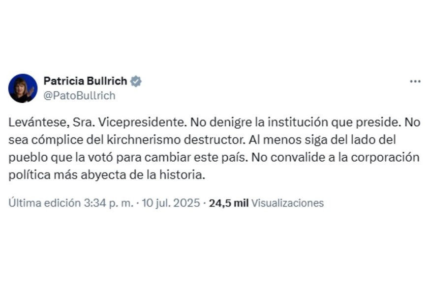 "Levántese, Sra. Vicepresidente. No denigre la institución que preside. No sea cómplice del kirchnerismo destructor. Al menos siga del lado del pueblo que la votó para cambiar este país. No convalide a la corporación política más abyecta de la historia", publicó en su cuenta de X.