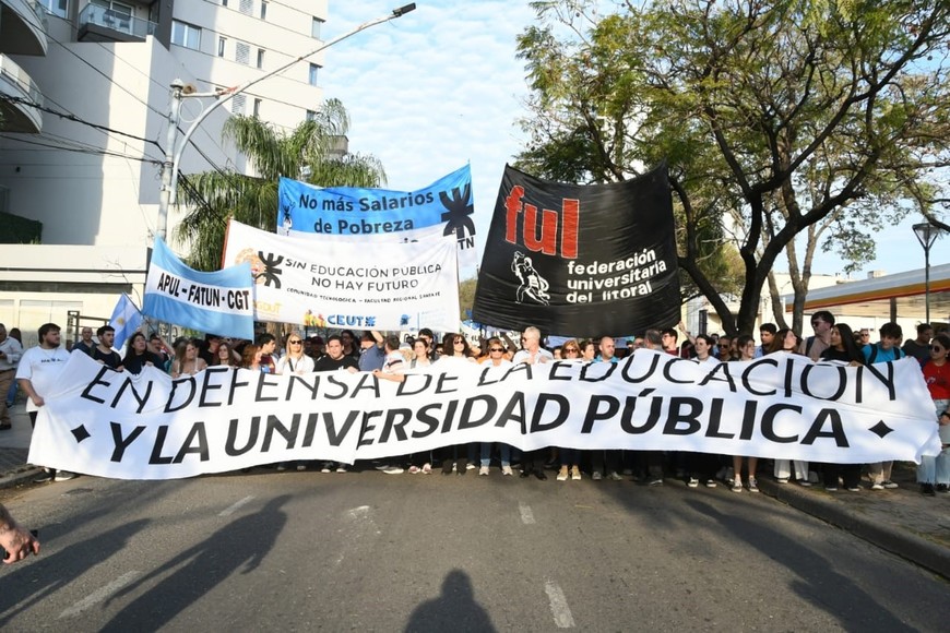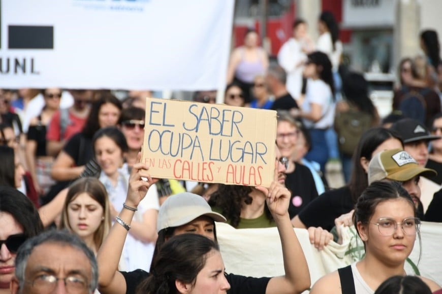 Por bulevar, a lo largo de unas cuatro cuadras se desplazan agrupaciones estudiantiles, gremios docentes y de personal no docente universitario en defensa del reclamo de fondos para las universidades públicas nacionales. Fotos: Manuel Fabatía.