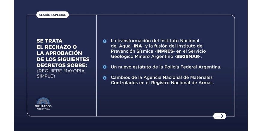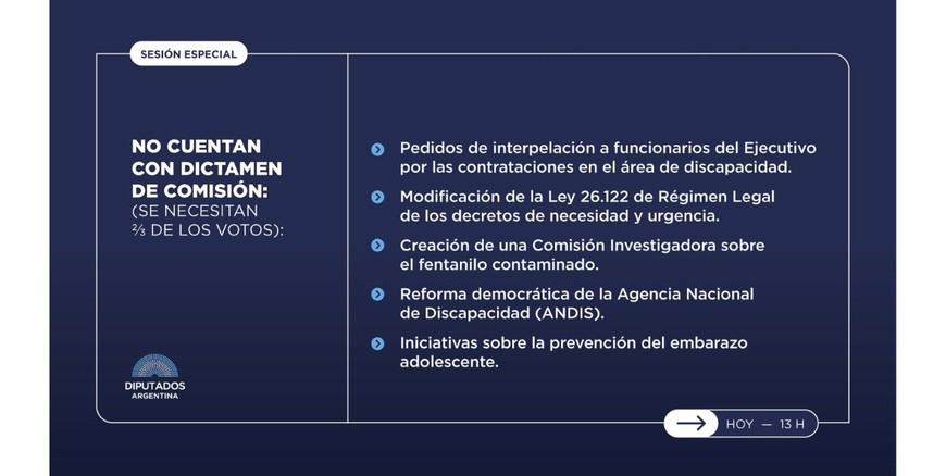 Algunos de los proyectos, al no contar con dictamen de comisión, requieren de 2/3 de los votos para su tratamiento en el recinto. Por otra parte, también es necesaria la aprobación de 2/3 de los presentes para insistir en los proyectos vetados por el Ejecutivo.
