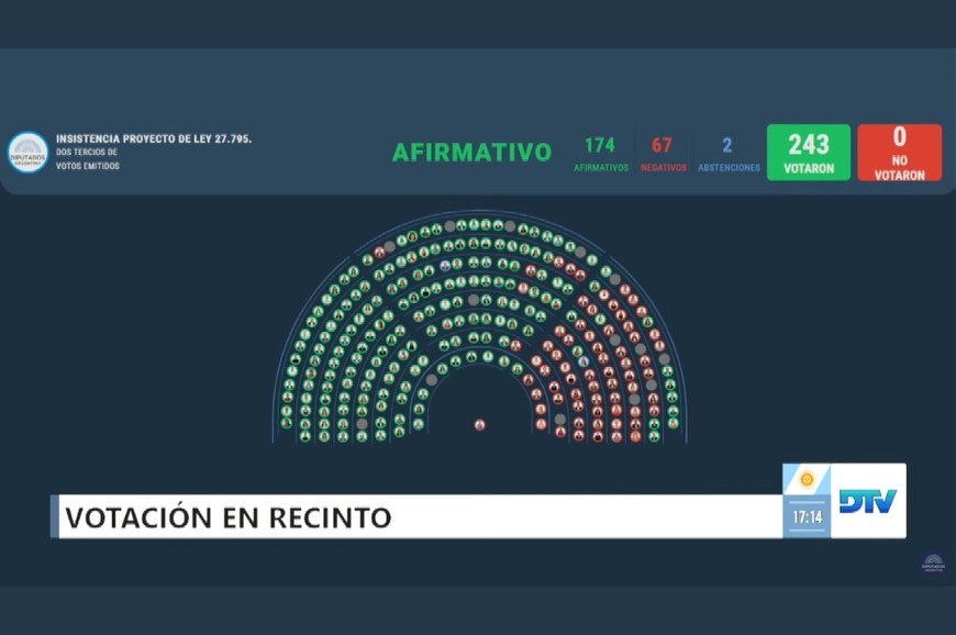 La Cámara de Diputados votó en rechazo al veto presidencial a la Ley de Emergencia Pediátrica y de Residencias, conocida como Ley Garrahan. La votación arrojó 174 votos afirmativos, 67 negativas y 2 abstención.