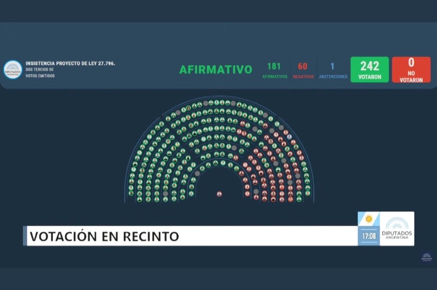 La Cámara de Diputados votó en rechazo al veto presidencial a la Ley de Emergencia Pediátrica y de Residencias, conocida como Ley Garrahan. La votación arrojó 181 votos afirmativos, 60 negativas y 1 abstención.