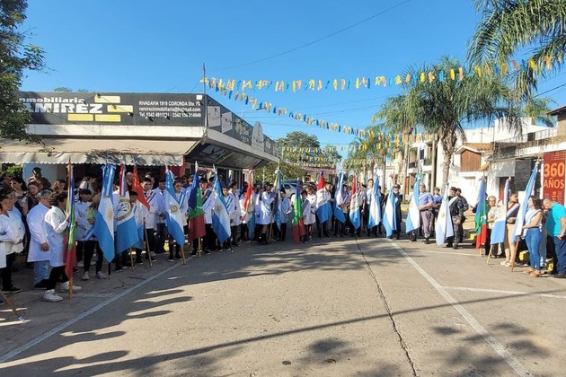 En primer lugar, por la mañana se desarrolló un acto oficial en la explanada del edificio municipal conocido como Casa Larrechea, donde se hicieron presentes las instituciones educativas, intermedias y deportivas de la ciudad con sus abanderados y escoltas.