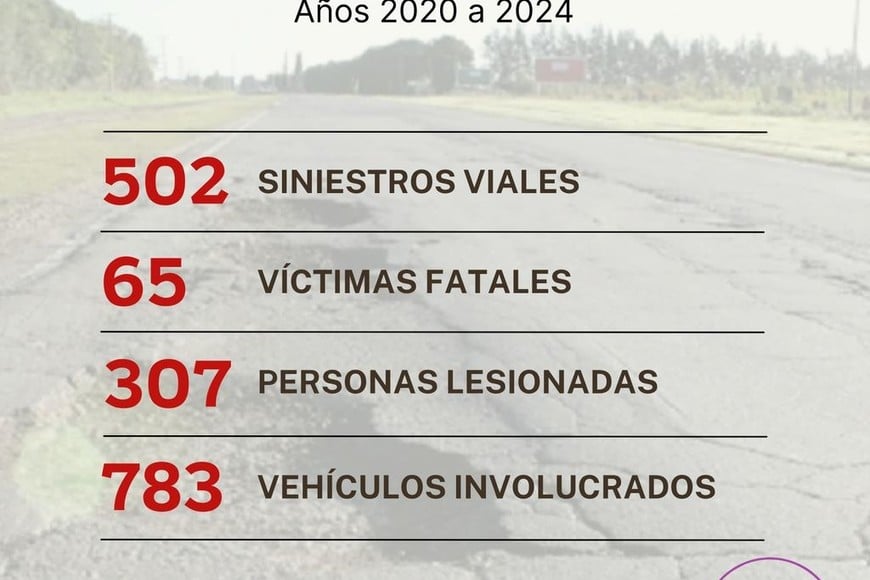 Desde 2020 hasta 2024, da cuenta de 502 accidentes viales, 65 víctimas fatales, 307 personas lesionadas y 783 vehículos involucrados.