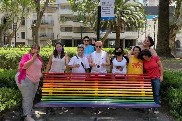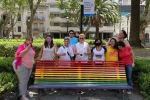Se hizo una pintada del banco en la plaza Pringles con los colores de la bandera LGTBI fue una propuesta que llevaron ellas a la Comisión de Feminismo del Concejo, ya que “en esa plaza fueron las primeras marchas del Orgullo de Rosario”.