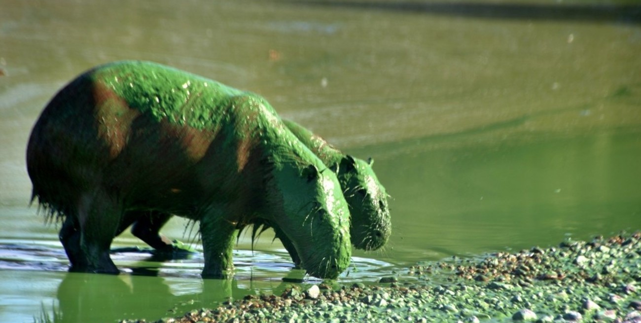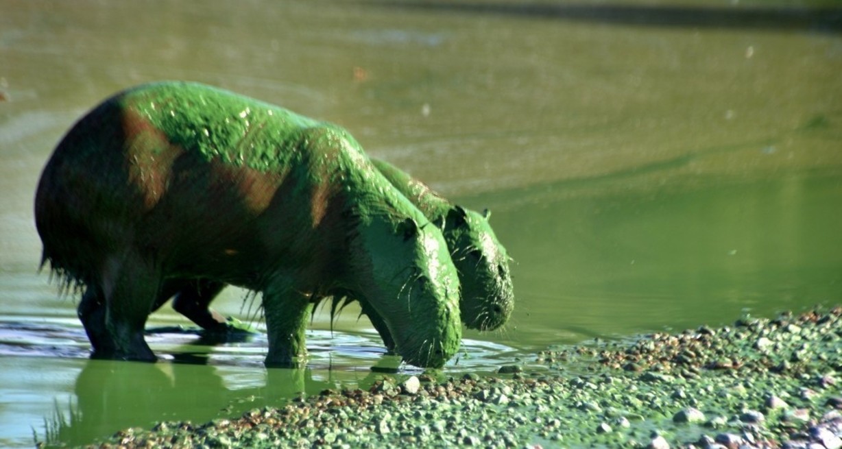 Triste postal. Los carpinchos bañados en el lago contaminado y su pelaje teñido verde. Crédito: gentileza Juan Menoni.